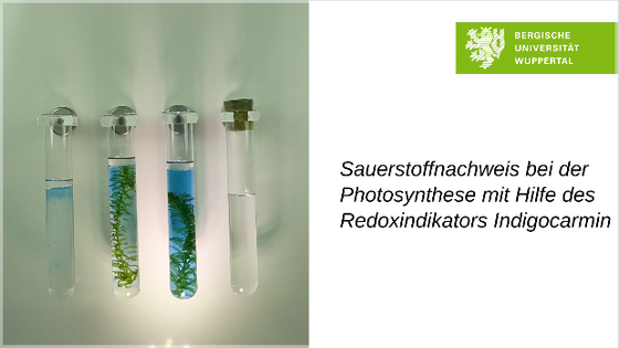 In diesem Video wird eines der Produkte der Photosynthese, Sauerstoff, mit Hilfe des Redoxindikators Indigocarmin gezeigt. Der entstehende Sauerstoff färbt die Lösung, in der die zuvor reduzierte Indigocarmin-Spezies vorgelegt wurde, durch Reoxidation mit Sauerstoff blau.