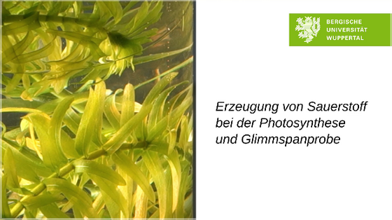 Das Video zeigt die Sauerstoffproduktion der Wasserpest bei Bestrahlung. Das entstehende Gas wird aufgefangen und anschließend mit der Glimmspanprobe identifiziert.