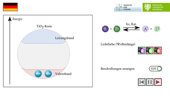 In dieser Animation wird die photokatalytische Umsetzung eines Donators und eines Akzeptors an einem Titandioxid-Korn bei Bestrahlung mit UV-Licht demonstriert.