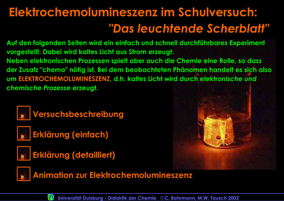 ECL (Elektrochemolumineszenz) - Versuchsanleitung und Animation zur Funktion des "Leuchtenden Scherblatts"